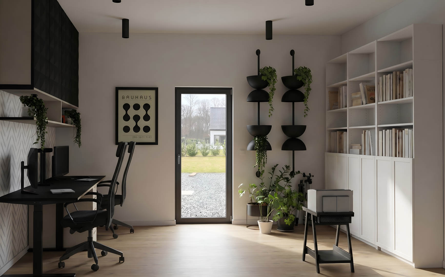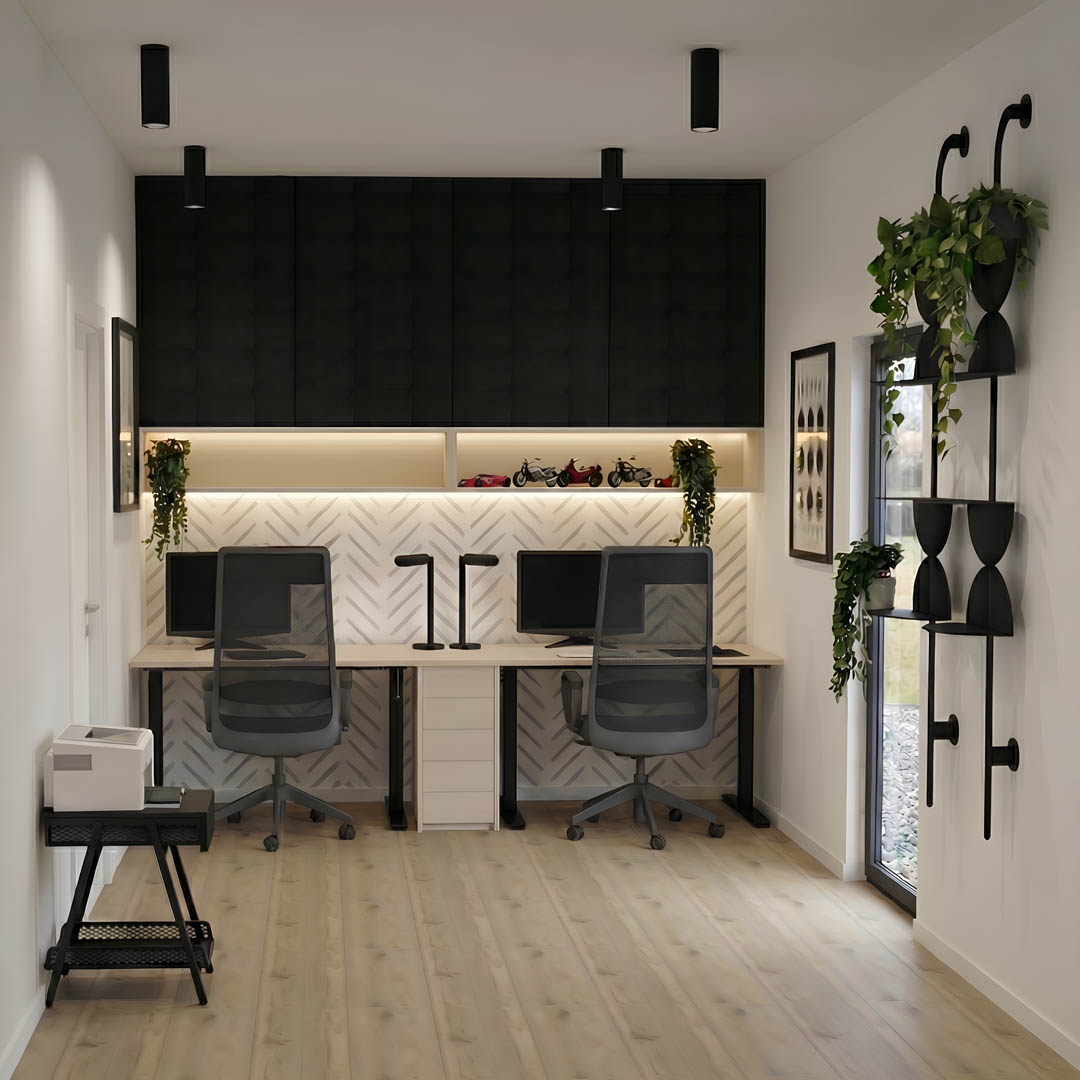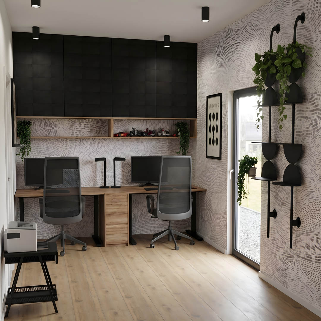 Projekt wnętrzaProjekt domowego biura dla małżeństwa na pracy zdalnej to odpowiedź na potrzebę oddzielenia sfery zawodowej od prywatnej. Głównym założeniem było stworzenie profesjonalnej przestrzeni do pracy, która po godzinach może pełnić funkcję miejsca do ćwiczeń.
