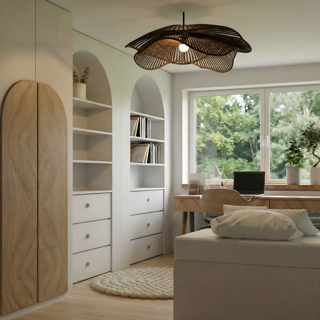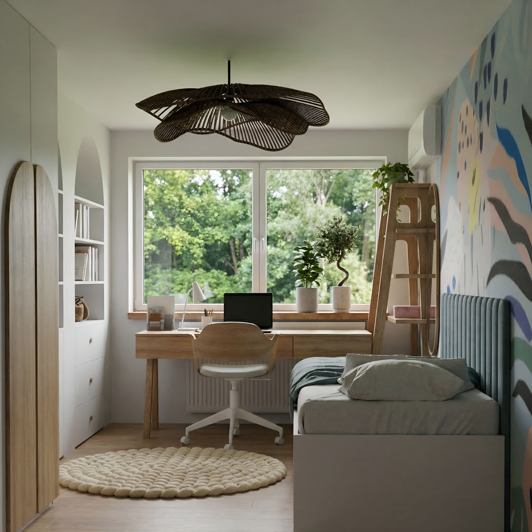 Przestrzeń została zaprojektowana tak, by zacierać granicę między wnętrzem a tym, co za oknem. Jasne drewno, rattanowa lampa o organicznym kształcie oraz pleciony dywan tworzą bazę, którą dopełnia energetyczna, malarska tapeta (wybrana przez małą użytkowniczkę). Ergonomiczne biurko umieszczone pod samym oknem pozwala na pracę w naturalnym świetle, w otoczeniu roślinności. To pokój, który inspiruje do kreatywności, a jednocześnie jest idealną przystanią do odpoczynku.