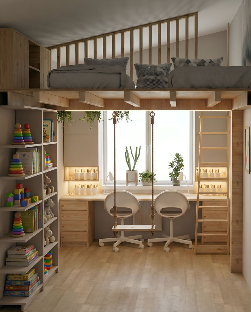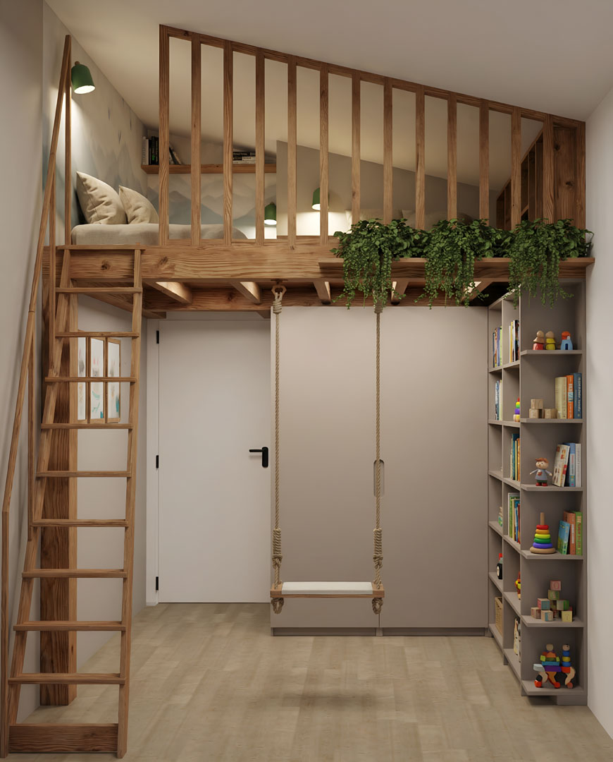 Ze względu na zapotrzebowanie rodziny na przestrzeń dla dwóch chłopców, zaprojektowano antresolę z częścią sypialnianą wraz z częścią dzienną pod nią. Uwolnienie przestrzeni na łóżka, pozwoliło maksymalnie wykorzystać miejsce pod zabudowy (szafy, regały) oraz biurka z miejscem dla każdego z chłopców. Estetyka opiera się na stonowanych kolorach, antresoli z drewna sosnowego wraz z dodatkami, które urozmaicają całą przestrzeń.