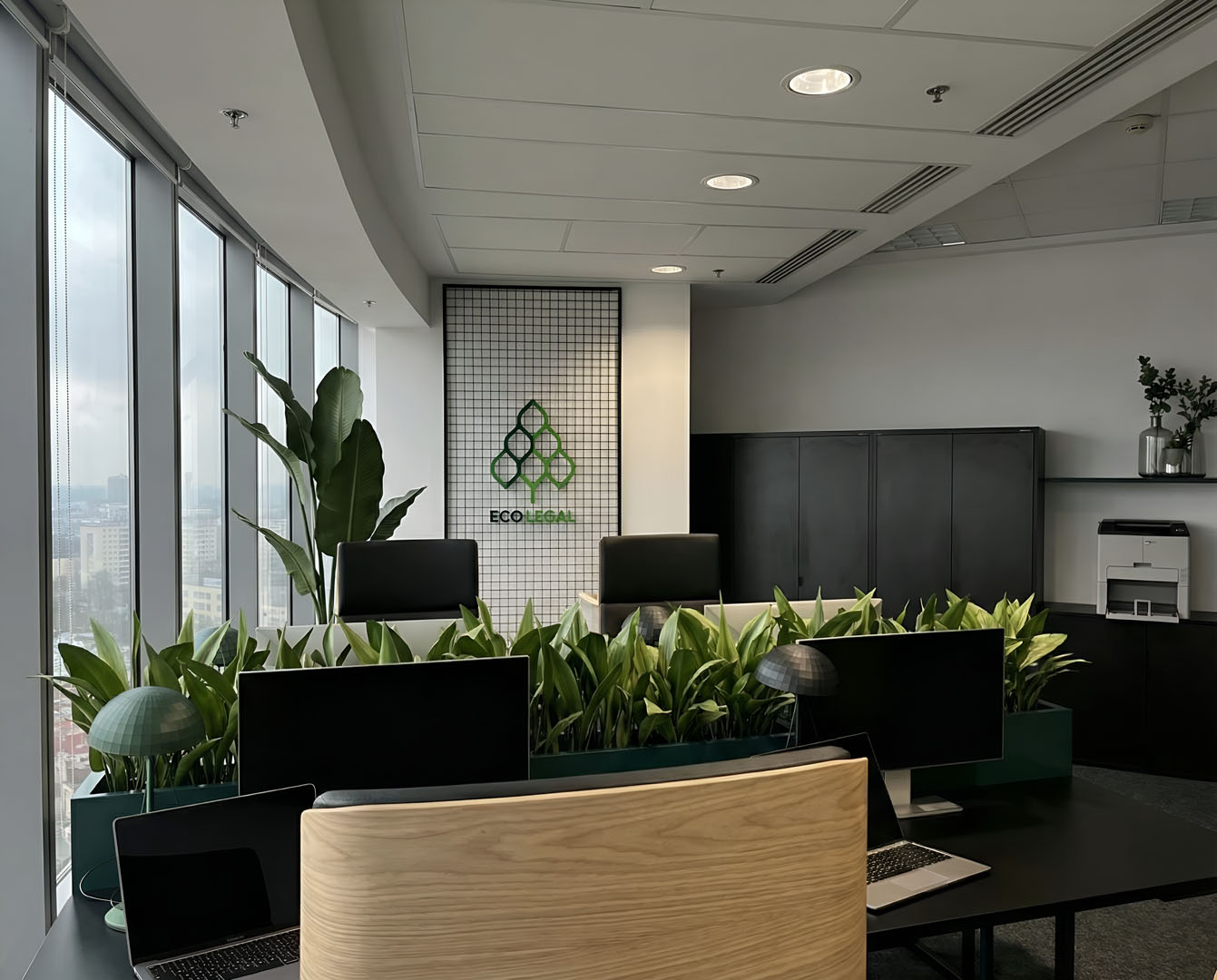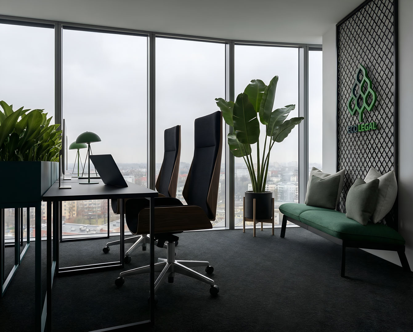 Główną specjalizacją kancelarii jest prawo ochrony środowiska, do czego nawiązuje samo logo. Dlatego też, ze względu na ekologiczny charakter firmy, głównym założeniem estetycznym dla tej przestrzeni miała być roślinność.