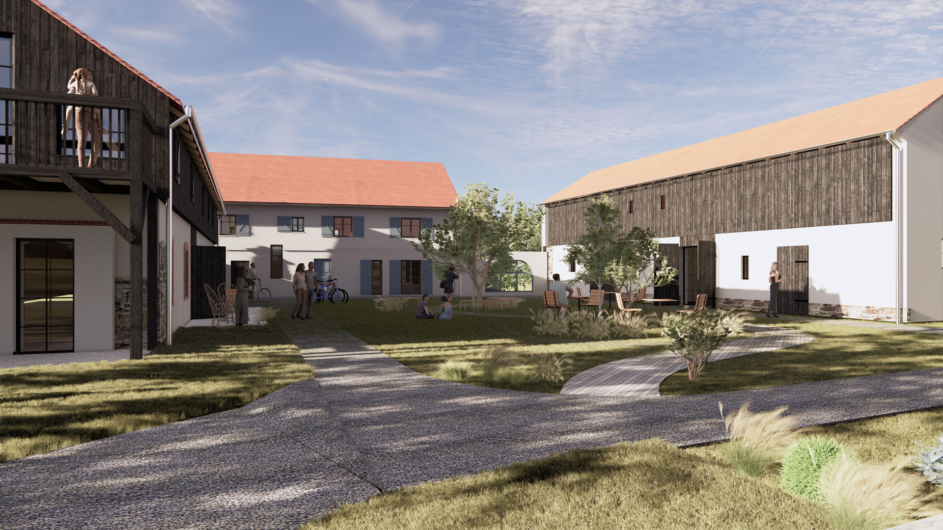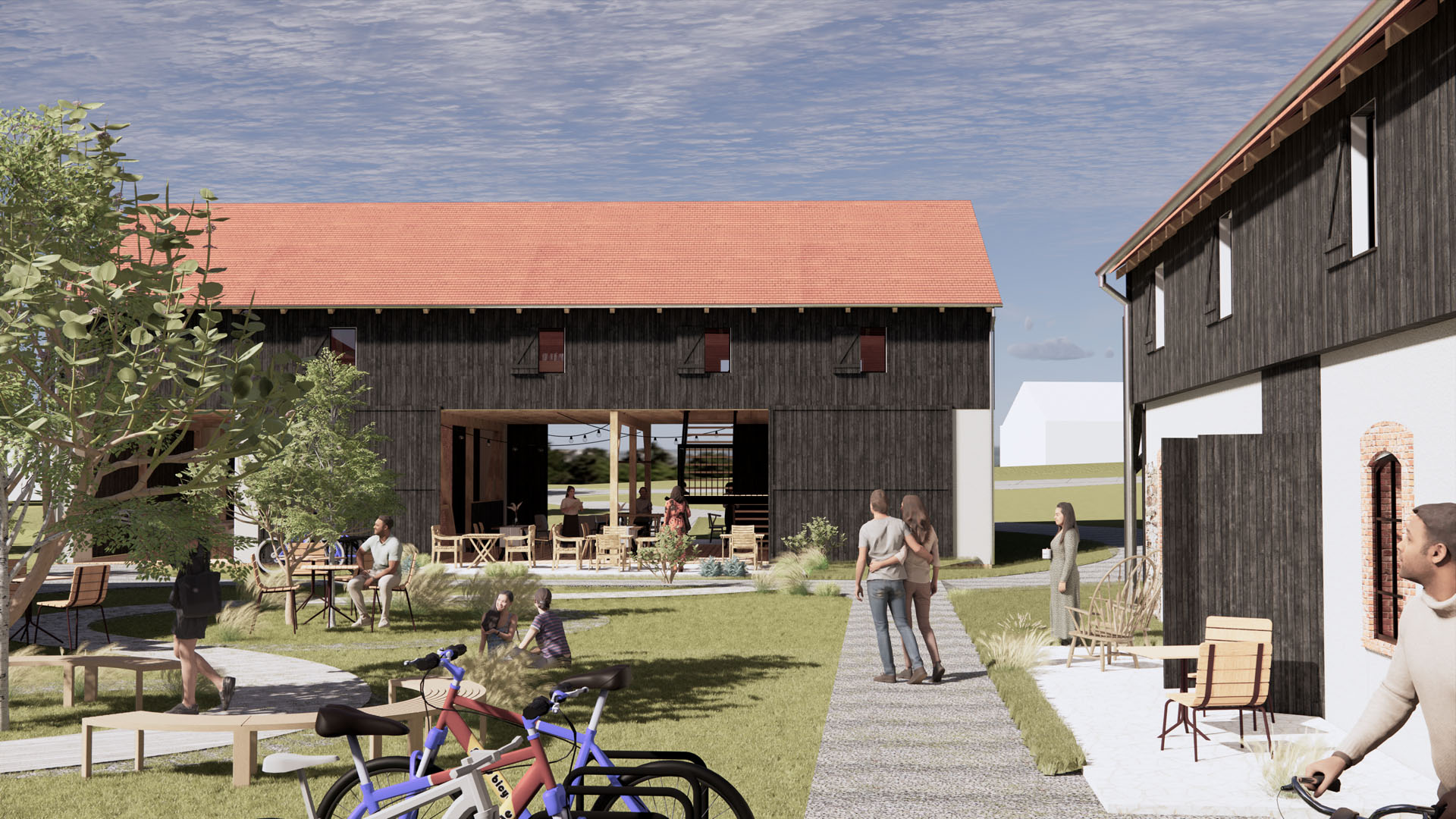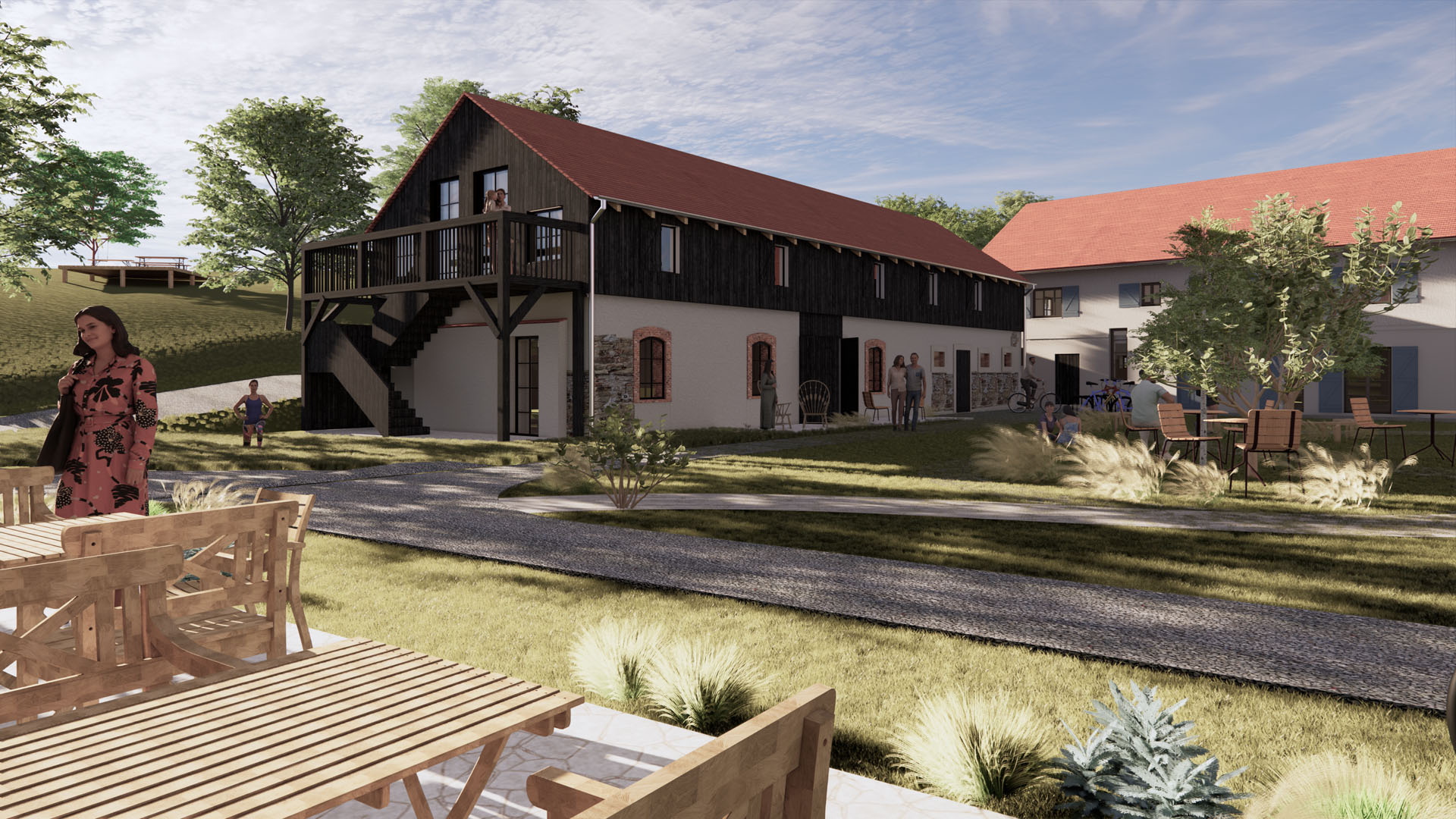 Kluczowym elementem założenia jest adaptacja jednej ze stodół na całoroczne centrum spotkań, integrujące funkcje kawiarni, ścianki wspinaczkowej oraz kameralnej sali kinowej. Wnętrza te utrzymano w surowej, rustykalnej estetyce, eksponując autentyczne rozwiązania konstrukcyjne, w tym reprezentacyjne, wielkogabarytowe drewniane wrota.